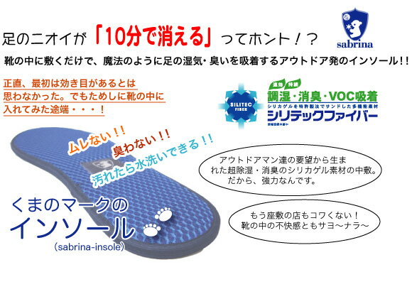 足のニオイが『10分』で消える!!sabrina insole/サブリナインソール 価格: 1,512円 レビュー評価: 0.0 レビュー数:0 メーカー(有)エクストリーム商品名sabrina insole/サブリナインソールサイズS.M.L.LL.3L定価1680-(税込)コンセプト■足のニオイが10分で消える!?靴の中におくだけで、魔法のように足の湿気・臭いを吸着するアウトドア用インソール。●3つのメリット ・ムレナイ ・臭わない ・汚れたら水洗い可能●オススメ用途 ・釣り・登山などのアウトドアシューズに ・ウェダー・長靴などの蒸れやすいブーツに ・スニーカー・ウォーkングシューズに ・女性用ブーツに●性能 ・裏面すべり止め加工 ・適度な厚みでフィット感抜群 ・新素材使用で吸着・消臭が強力●サイズ S・・・23.5?24.0cm Supported by 楽天ウェブサービス |